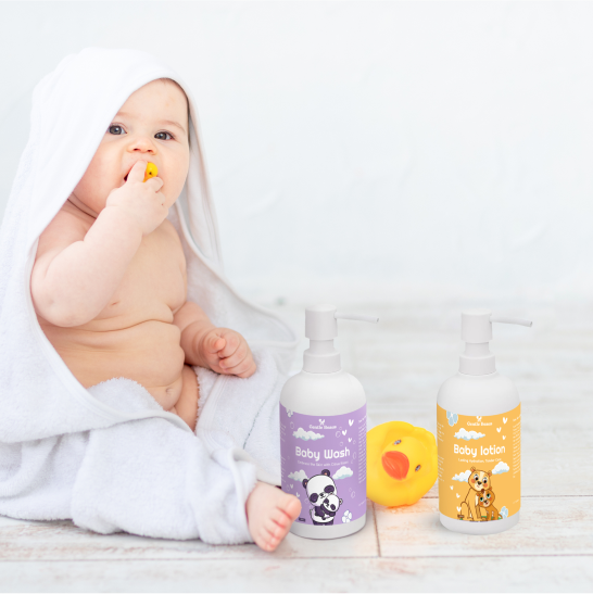 Our Bath Essentials combines cleansing and moisturizing products with a playful toy to create a holistic bath time routine. The Baby Body Wash cleanses gently, while the Baby Lotion provides lasting hydration, and the Floating Duck Toy adds an element of fun.
